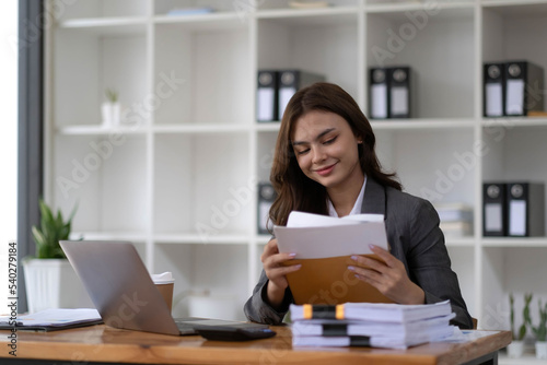 Photo of cheerful young woman working using computer laptop concentrated and smiling at office
