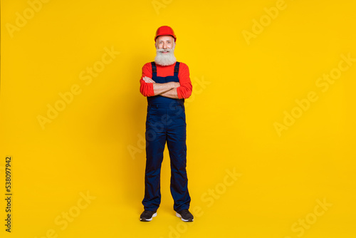 Photo of confident good mood senior guy dressed uniform overall red hardhat arms crossed isolated yellow color background