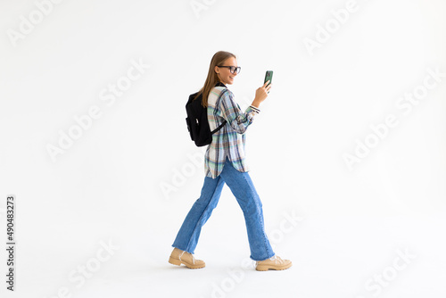 fun, person, 1, mobile, lovely, looking, portrait, isolated, happy, smartphone, girl, phone, female, photo, white, video, background, backpack, mobile phone, young, caucasian, brunette, call, woman, teenage, posing, pretty, student, wall, study