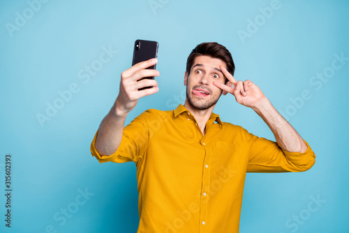 Photo of foolish ridiculous man showing v-sign sticking toungue out holding phone taking selfie behaving childish isolated over pastel blue color background