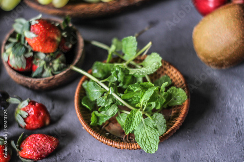 Photo of fresh mint leaves in a bowl. Mint and strawberry. Ingredients for summer cocktails and lemonade. Herb. Still life photography. Image