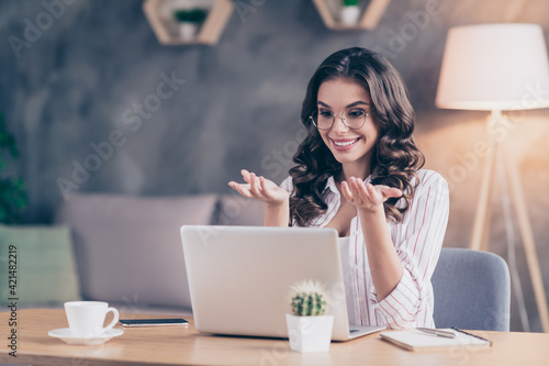 Photo of friendly cute young lady wear white shirt spectacles talking modern gadget sitting table indoors inside room home