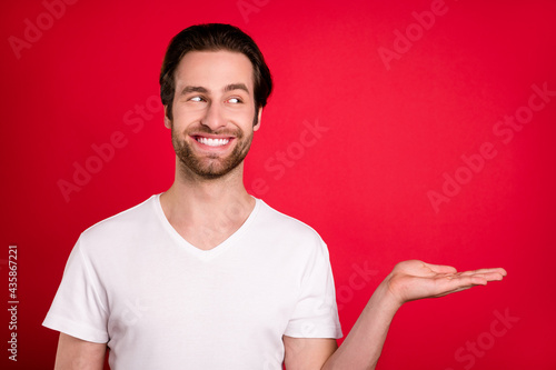 Photo of funny millennial brown hairdo man hold hand look empty space wear white t-shirt isolated on vivid red color background