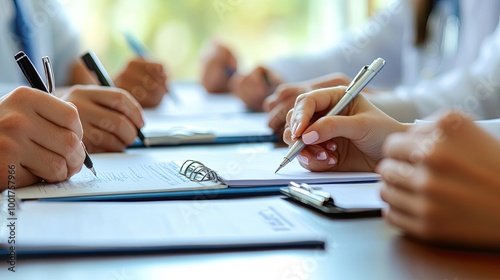 Photo of hands, doctor and writing in notebook during meeting, discussion and report for health care service in office for feedback or inspection in hospital.