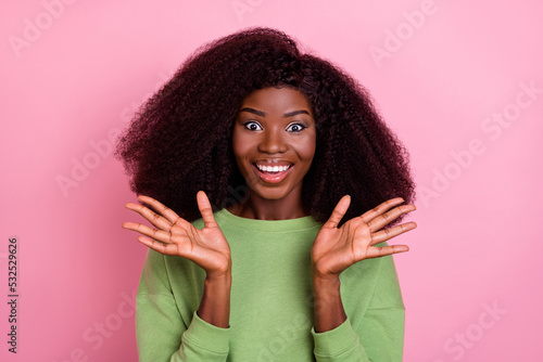 Photo of impressed big hairdo brunette lady hands up wear green sweatshirt isolated on pink color background