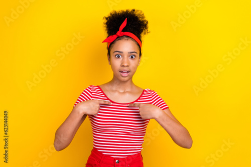 Photo of impressed funky girl dressed red striped t-shirt pointing fingers herself isolated yellow color background