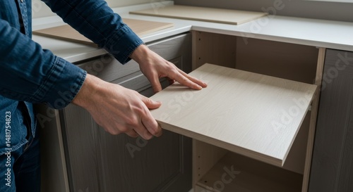 installing, kitchen, cabinet, shelf, wood, home, improvement, bricolage, renovation, construction, house, interior, design, furniture, work, carpenter, man, hand, building, new, repair, maintenance, domestic, housing, real estate, property, homeowner, update, upgrade, modern, style, carpenter's shop, craft, tool, skill, labor, contractor, project, development, residential, room, decor, architecture, grey, white, closeup, detail, texture, material