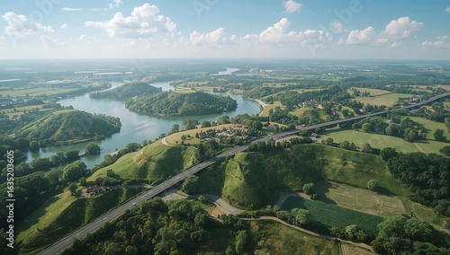 Photo of panoramic aerial view captures the serene beauty of a winding river flowing through a lush green landscape under a blue sky