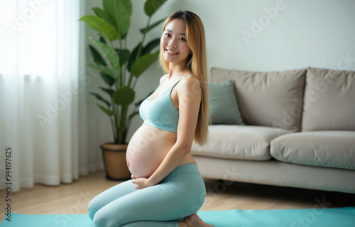 photo of pregnant woman doing yoga pose relaxing activity, generative AI