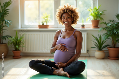 photo of pregnant woman sitting and do yoga pose at her room, generative AI