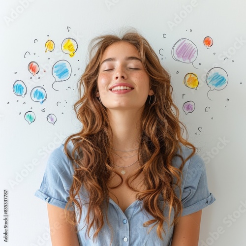 photo of social media speech bubbles popping out from a person's head/mind. She is happy.