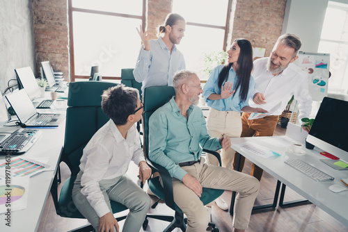 Photo of teamwork startup partners discussion paperwork comfortable nice creative startup office loft room interior