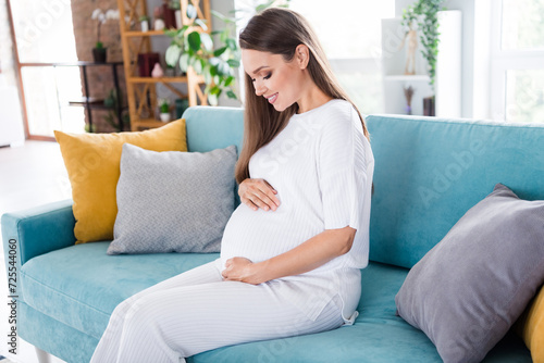 Photo of tender gentle lovely pregnant girl wear white pajama touch belly wait for newborn son daughter weekend day indoors