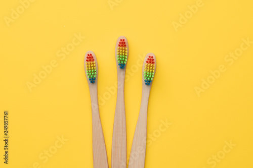toothbrush, wooden, rainbow, many-coloured, coloured, bamboo, health, care, teeth, isolated, background, empty, yellow, three, center, material, object, household, cavity, craft, colours, personal, protection, morning, daily, horizontal, instrument, beauty, image, equipment, wood, object, soft, fresh, ecological, professional, pattern, design, medicine, nobody, gingivitis, toothbrush, clean, shape, brush, life, domestic, bathroom, photo