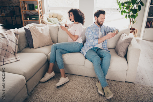 Photo of two people sit couch using cell smart gadget chatting in room house indoors