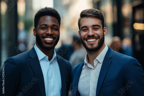 photo of two young business men in suits smiling into the camera at work in the office in finance.