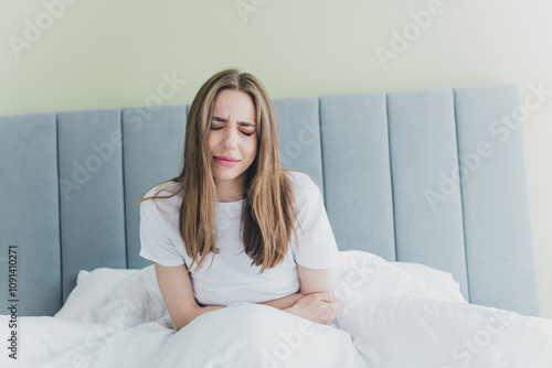 Photo of unhappy upset lady dressed sleepwear sitting bed feeling stomach ache indoors room home house
