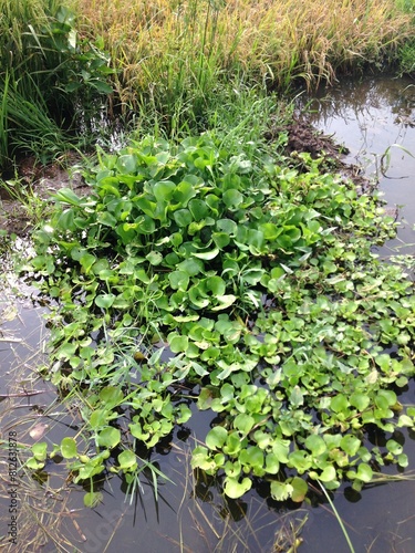 photo of water hyacinth plants in rice fields