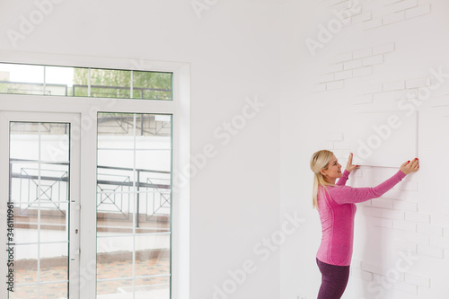 Photo of woman looking at the blank white canvas. Horizontal, mockup