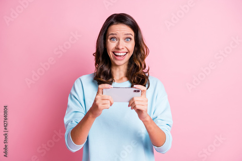 Photo of young attractive girl excited happy positive smile pay game smartphone browse like isolated over pink color background