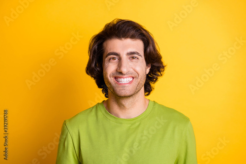 Photo of young attractive positive cheerful multiethnic guy toothy smile isolated over yellow color background