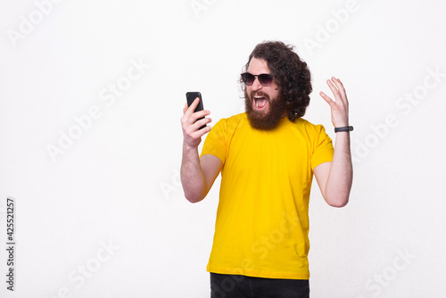 Photo of young hipster man with beard and long curly hair screaming at smartphone