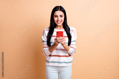 Photo of young woman unhappy sad upset worried bite lips teeth mistake look cellphone isolated over beige color background