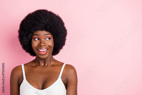 Photo portrait curly girl in white top smiling looking copyspace isolated pastel pink color background