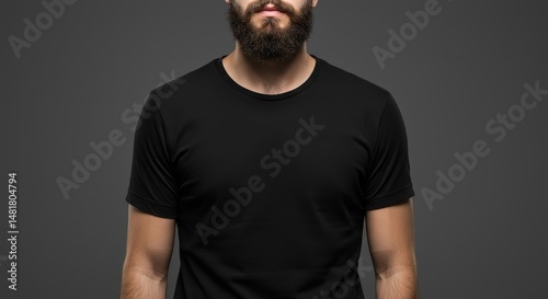 man, portrait, beard, black shirt, grey background, studio shot, serious, masculine, adult, male, person, guy, facial hair, closeup, head shot, simple, dark, neutral, modern, clean, minimal, fashion, style, clothing, t-shirt, casual attire, confident, calm, blank, template, body, torso, arm, hand, chest, hair, grooming, skin, texture, detail, shadow, light, contrast, photo, image, visual, representation, human