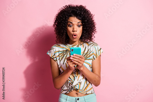 Photo portrait of shocked woman holding phone in two hands isolated on pastel pink colored background