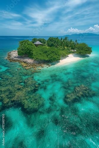 Photo réaliste professionnelle d’une petite île tropicale entourée d’eaux turquoise et de plages de sable blanc