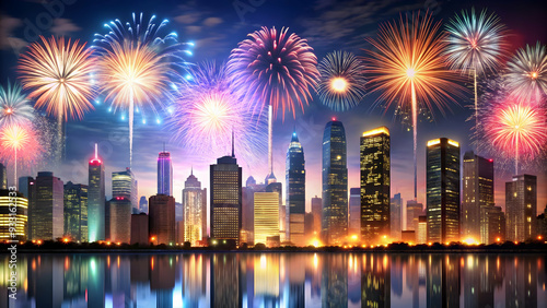 Photo Realistic as City skyline with fireworks concept as A dynamic city skyline with fireworks celebrating hard work and progress ideal for business presentations needing a clean and festive backgrou