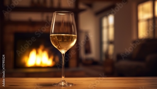 Photo realistic highly detailed glass of white wine standing on clear wooden table against cozy fireplace
