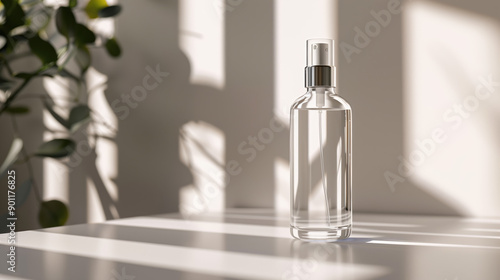 Photo Realistic Transparent Empty Glass Cosmetic Bottle in Minimalist White Room with Natural Light – Detailed and High-Quality