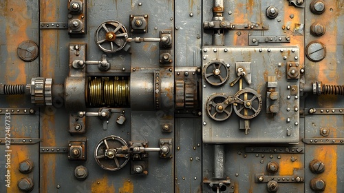 bank, vault, metal, door, mechanical, lock, security, safe, treasure, deposit, money, wealth, protection, classic, antique, vintage, industrial, machinery, engineering, steel, chrome, bronze, gear, mechanism, texture, pattern, aged, rust, old, retro, heritage, chamber, stronghold, coffer, interior, technology, device