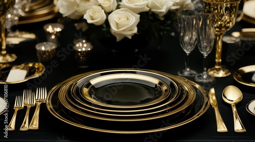 photograph, elegant, black, gold, border, illustration, glamourous, table, setting, lavish, dining, formal, event, tablecloth, contrast, dinnerware, plate, ed, line, cutlery, polished, reflecting, centrepiece, vase, accent, rose, composition, refined, luxury, element, sophisticated