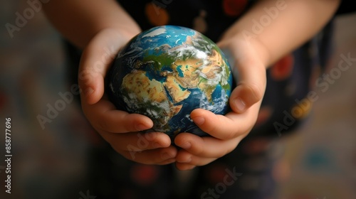 Photograph of a child's hands, gently caressing a globe, conveying a sense of tenderness and responsibility towards our precious planet