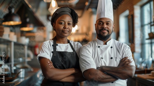 Photograph of a male chef and an African American female co-worker standing with arms crossed and looking at the camera.