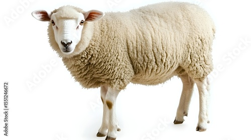 sheep, animal, domestic, wool, white, fluffy, mammal, farm, pasture, portrait, studio, closeup, head shot, cute, peaceful, calm, serene, standing, posture, long legs, hoof, snout, muzzle, eye, gaze, light, detailed, texture, fur, woolly, coat, farm animal, farm animal, white coat, gentle, isolated, studio shot