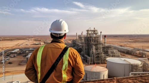photograph of an architect standing in awe of a massive oil rig in the middle of a desert, with the sun setting in the background