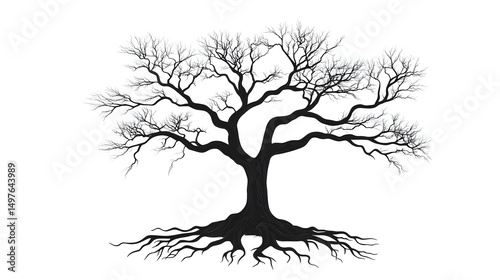 silhouette, tree, branch, root, black, outline, stark, minimalist, design, abstract, linear, dramatic, gothic, dark, strong, powerful, ancient, resilient, woody, natural, organic, symmetric, complex, detailed, artistic, vector, illustration, graphic, shape, form, beauty, strength, stillness, contemplation, mystery, symbol, winter, bare, barren