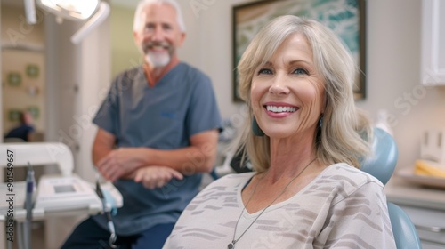 Photograph of happy woman having eye exam at optometrist with smile. Optician checks vision, iris, or retina for elderly consumer.
