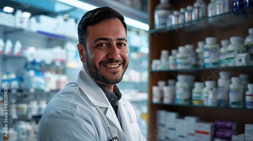 photograph of Smiling portrait of a handsome pharmacist in a pharmacy store.generative ai