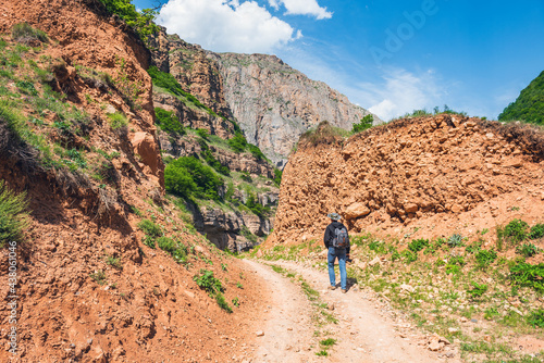 Photographer traveler with camera and backpack walking on dirt road in mountains