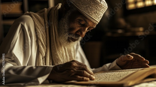 islamic, elder, reading, book, focused, beard, wrinkle, wisdom, study, concentrated, serene, peaceful, traditional, hat, robe, calm, learning, scholar, devout, religion, spirituality, dedication, text, literacy, cognition, education, aged, male, senior, cultural, goggles, warm, light, hand, parchment, finger, closeup, indoor, solemn, meditative, quiet, profile, intense, character, line, expression, depth, thoughtful
