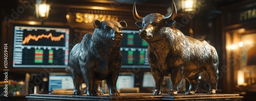 Photorealistic bronze bull and bear statues symbolizing market trends on a trading desk background