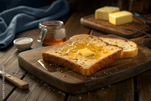 toast, close, up, photorealistic, uneven, porous, texture, glowing, light, layer, melted, butter, glisten, rustic, wooden, table, breakfast, food, appetising, delicious, warm, crispy, bread, slice, detail, studio, lighting, realistic, homemade, comfort