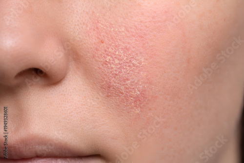 Photorealistic dermatology clinical close-up of the nasolabial fold area showing mild seborrheic dermatitis: subtle pink-red patch along the fold with fine slightly greasy scale