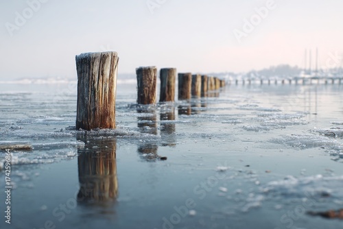 Photorealistic Frozen Harbor Posts in Thin Ice with Blurred Distant Shore