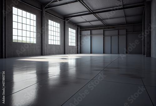 Photorealistic interior of a large empty industrial warehouse or hangar with a concrete floor. AI generative.